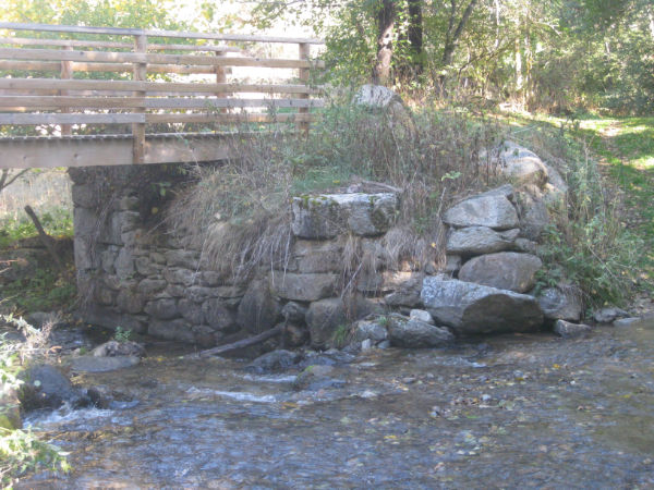 Al final de la baixada girem a la dreta per creuar el riu d'Eina per un pont de fusta, que substitueix un antic pont d'origen romà del qual hi podem veure restes de la seva base a cada vorera.
