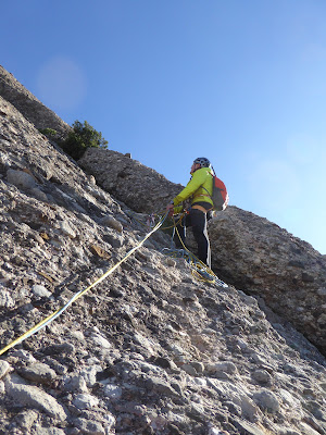 En Jaume comença a enfilar-se recte amunt per una placa inclinada, a tocar d’una llastra, on encara hi toca l’ombra i fa un fred que pela, i com que està desequipada hi posa alguns “flotants”. Quan en Jaume arriba a la primera reunió, amb alegria veig que ja li toca el sol.
