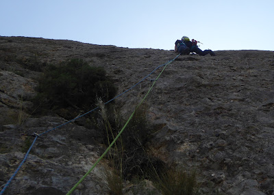 Mentre en Pau s’enfila pel marcat esperó de la segona tirada, jo em fixo que molt més a la dreta hi ha una altra cordada que inicia el seu particular ascens. Avui, al contrari de fa una setmana, fa quasi fresqueta i per això no em trec la màniga llarga. Així ens trobem de nou al còmode replà on està situada la segona reunió.